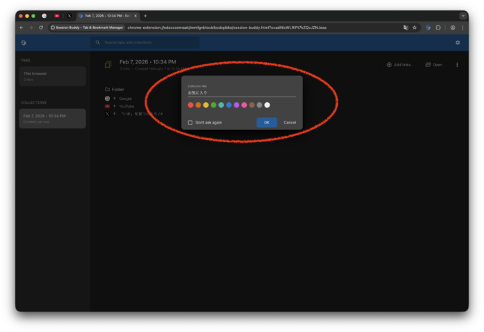 • Session Buddyを使えば、固定タブを含むコレクションを保存・復元できる