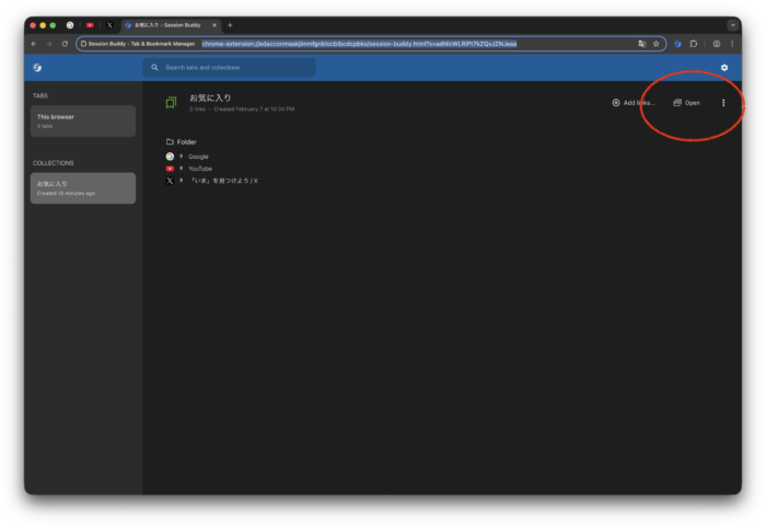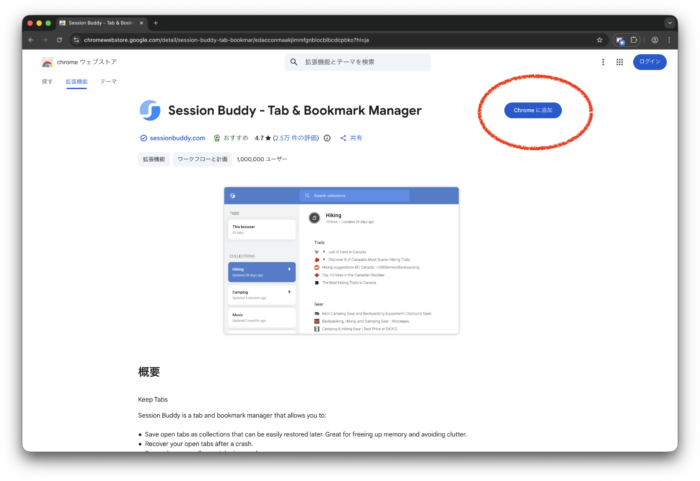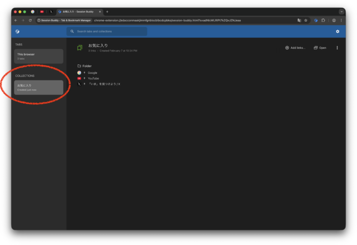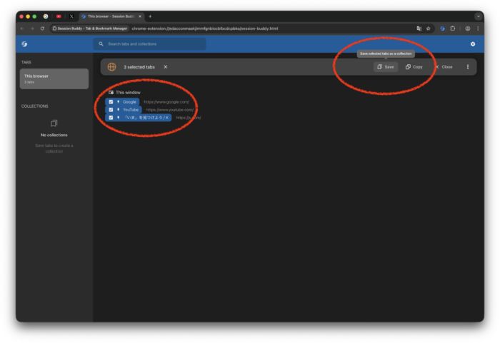 Session Buddyは、Chromeのタブやウィンドウの状態を「コレクション」として保存・管理できる拡張機能です。