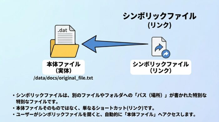 シンボリックリンクとは、別のファイルやディレクトリへの「パス(場所)」を持つ特殊なファイルです。