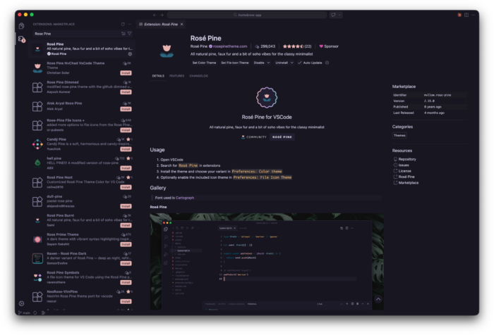 Rose Pineは、落ち着いたトーンとバランスの取れた配色が特徴的なカラーテーマです。多くのエディタやターミナルアプリケーションに対応しており、統一感のある開発環境を構築できます。